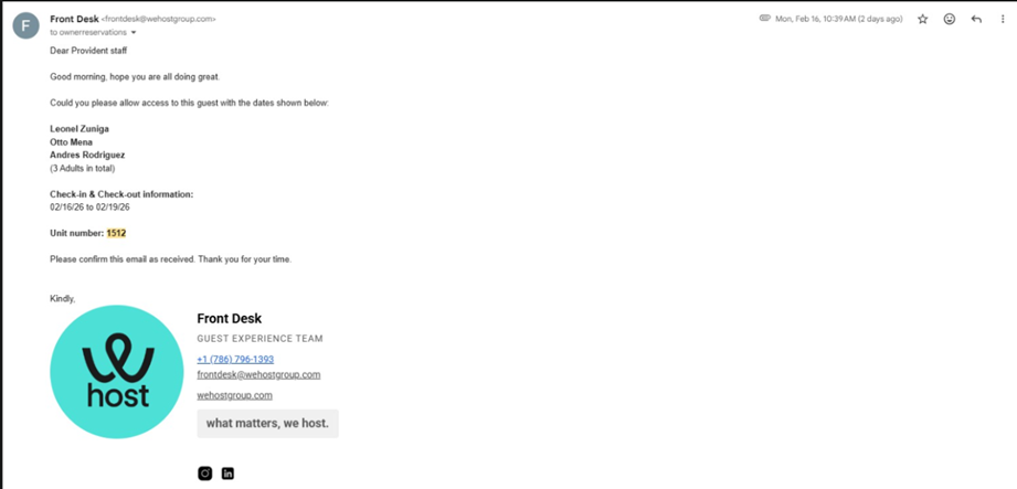 This registration is done by sending an email to the building with the information of all adult guests who will be staying in the corresponding unit, along with the attached IDs.