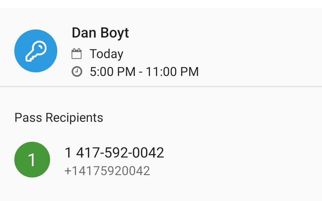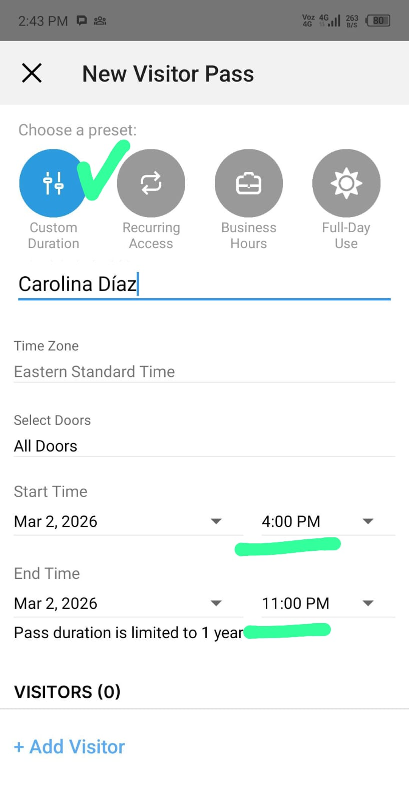 Select the unit number to provide an access and create a new one VISITOR PASS, on this screen you need to create the guest in the opction CUSTOM DURATION, create a name and phone number or email address to send the code and select the valide shecedule code time (example: From 4 pm until 11:00 pm or more if the guest will arrive at midnight)