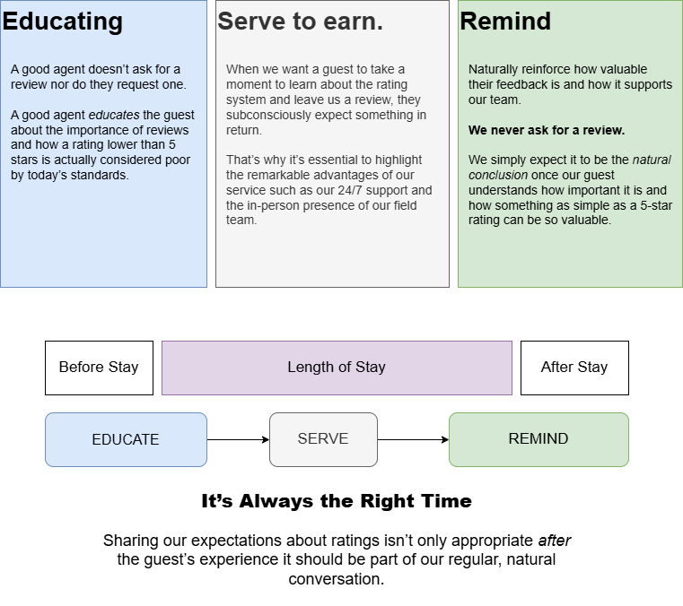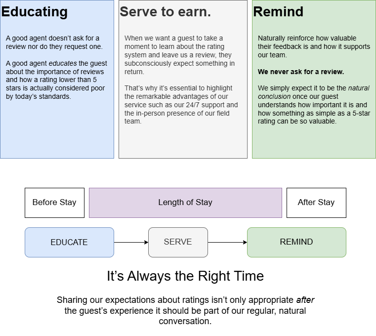 - The main goal is to turn every guest interaction into an opportunity to educate, connect, and inspire genuine 5-star feedback.
